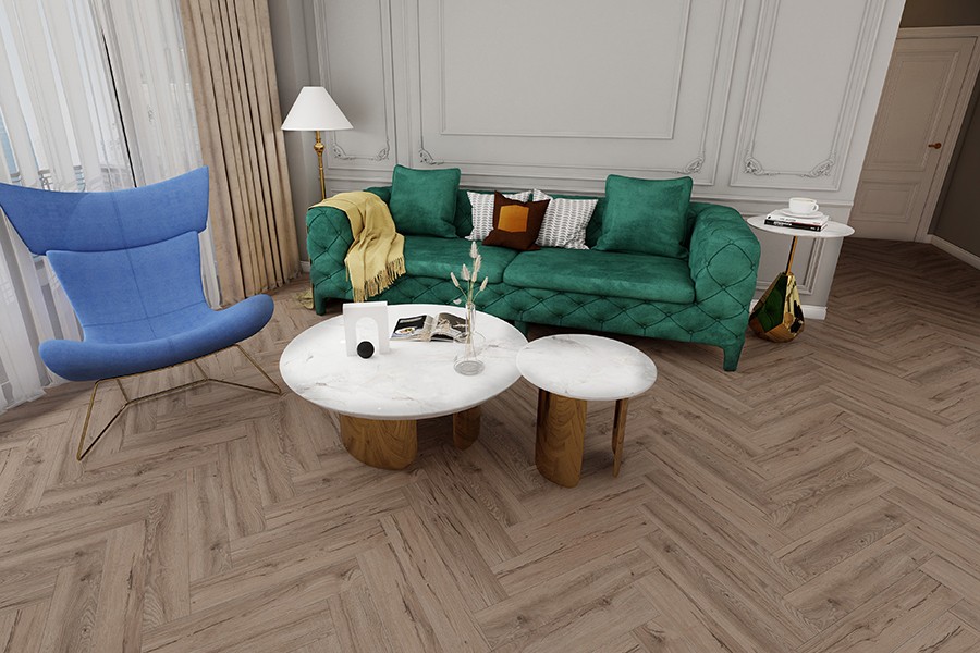 Кварцвинил клеевой Oak Foster ICON коллекция Purple LVT — кварцевениловая клеевая плитка с укладкой “ёлочкой”. Такой вид укладки визуально увеличивает пространство, имитирует натуральный паркет. Укладка ёлочкой является нестареющей классикой, которая не теряет популярности долгие годы.