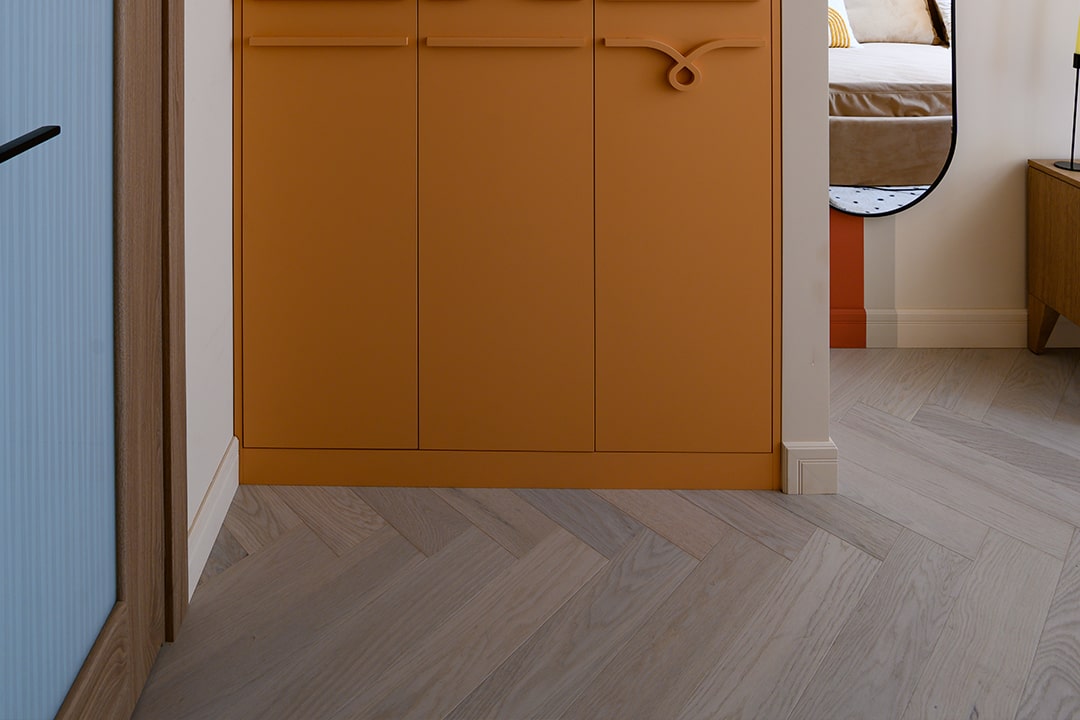 В этой квартире паркетная доска Auswood, коллекция «Herringbone», оттенок натуральный дуб сканди Elba Oak— основа всего интерьера. Светлый, словно первый солнечный луч, он наполняет пространство воздухом, тёплой гармонией и чувством завершённости.